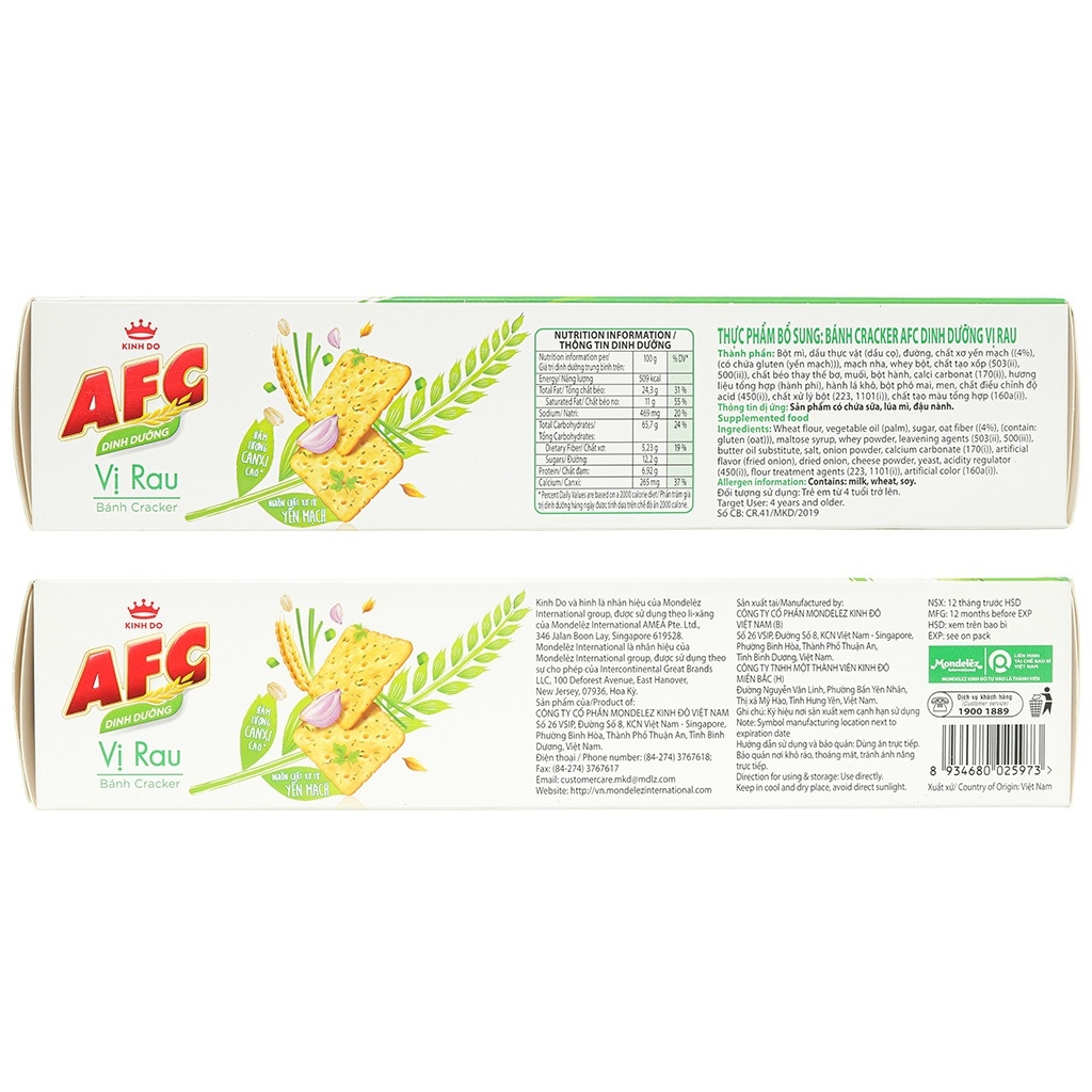 * Bánh quy AFC có bổ sung khoai tây, cung cấp năng lượng, protein, chất xơ, đặc biệt là vitamin D và canxi giúp xương chắc khỏe và đồng thời tăng cường hệ tiêu hóa. Bánh cracker vị Rau/ Vị Lúa Mì AFC Dinh Dưỡng hộp 172g thích hợp làm món bánh quy ăn nhẹ bổ dưỡng cho những người bận rộn. - Loại: Bánh cracker vị rau/ lúa mì - Khối lượng: (8 gói x 21.5g) - Năng lượng: khoảng 509kcal /100g - Điểm nổi bật: Giàu chất xơ, Vitamin E, có bổ sung chất xơ từ yến mạch - Thành phần: Bột mì, dầu thực vật (dầu cọ), đường, chất xơ yến mạch (4%), mạch nha, bột whey, chất tạo xốp, chất béo thay thế bơ, muối, bột hành, calci carbonate (170i), hương liệu tổng hợp (hành phi), hành lá khô, bột phô mai, men, chất điều chỉnh độ acid, chất xử lí bột, chất tạo màu tổng hợp. - Phù hợp: Trẻ em từ 4 tuổi trở lên. - Công dụng: + Sản phẩm có bổ sung chất xơ và vitamin E tốt cho hệ tiêu hóa và giúp cho làn da luôn tươi trẻ. + Sản phẩm có bổ sung canxi và vitamin D - hỗ trợ xương chắc khỏe và hấp thụ canxi tốt hơn * Tác dụng của sản phẩm với sức khỏe + Cung cấp năng lượng, là bữa ăn phụ chất lượng + Cung cấp dưỡng chất cho cơ thể + Giúp chắc răng, khỏe xương + Hỗ trợ phát triển chiều cao và trí não * Bảo quản: Để nơi khô ráo, thoáng mát, tránh ánh nắng trực tiếp * Lưu ý: Sản phẩm có chứa bột mì, sữa và đậu nành * Thương hiệu: AFC * Nơi sản xuất: Việt Nam