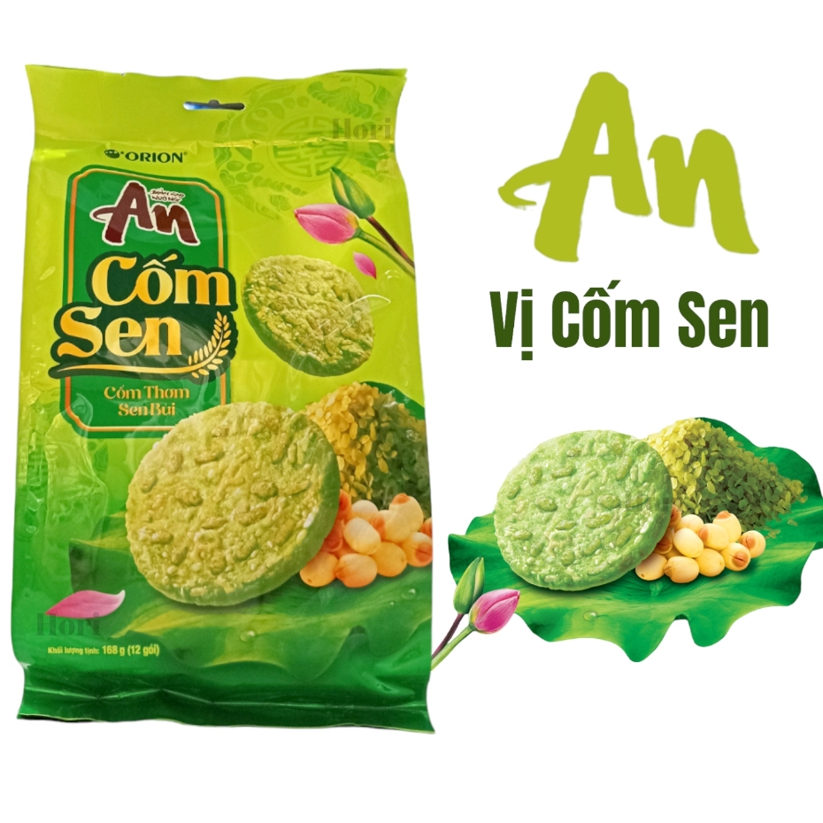 * Bánh gạo nướng An nay có thêm hương vị mới với sự kết hợp có cốm Hà Thành thơm ngon và lá sen mang đến những chiếc bánh gạo chất lượng, thơm lừng và toát lên nét đẹp văn hoá độc đáo. * ‘Cốm’ xưa nay luôn được xem là thức quà mang đậm nét đẹp ẩm thực truyền thống riêng biệt của Việt Nam khi không chỉ là một hương vị dân dã mà còn là biểu tượng níu giữ tâm hồn những người con Hà Nội xa quê. Hẳn những ai đã từng ghé qua Hà Nội vào những ngày thu, sẽ bắt gặp đâu đó trên phố phường những gánh hàng cốm. Hình ảnh hạt cốm gói ghém trong từng lá sen toát lên hương vị thơm lừng thật xao xuyến đã khắc sâu vào tâm hồn của người dân nơi đây. * Bánh gạo nướng An Cốm Sen của Orion giữ trọn nguyên liệu truyền thống từ những hạt gạo Japonica cao cấp và được nghiên cứu sản xuất với dây chuyền công nghệ hiện đại để mang đến một chiếc bánh gạo to, dày hơn, giòn ngon hơn với lớp cốm dẹp xanh phù trên bề mặt một cách độc đáo. Hơn cả một chiếc bánh gạo đơn giản, An Cốm Sen sẽ khiến bạn cảm giác thưởng thức cuốn không thể dứt qua hương vị thơm nồng của cốm hòa quyện cùng vị ngọt bùi đặc trưng của bột hạt sen và lá dứa. Đặc biệt, phần vỏ bánh thơm nồng mùi gạo với lớp cốm dẹp xanh giòn rụm chắc chắn sẽ khiến vị giác của bạn bừng lên khi vừa mới cầm trên tay chiếc bánh này. * Lưu ý & cách bảo quản: - Khi mở gói bao bì bạn nên sớm sử dụng, tránh để sản phẩm tiếp xúc lâu với không khí làm ảnh hưởng đến chất lượng sản phẩm. - Đối với những sản phẩm chưa dùng bạn có thể buộc kín gói, bảo quản nơi khô ráo, thoáng mát, tránh nhiệt độ cao. - Không dùng khi bánh có dấu hiện ẩm mốc, bị hỏng hoặc hết hạn sử dụng. * Thương hiệu: Orion * Xuất xứ: Việt Nam * HSD: 8 tháng từ ngày sản xuất * Bao bì sản phẩm có thể thay đổi theo từng đợt nhập hàng