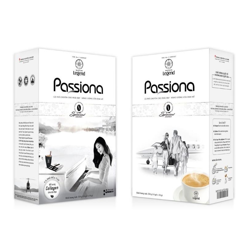 Mô tả sản phẩm: + Cà phê dành cho phái đẹp mang lại trọn vẹn hương vị quyến rũ của cafe cũng như tận hưởng những lợi ích do cafe đem lại cho vẻ đẹp và sức khoẻ. + Cà Phê Passiona 4in1 Trung Nguyên (Hộp 14 Gói) cà phê dành cho phái đẹp. Với hàm lượng caffein thấp, bổ sung collagen, chất chống lão hóa, cùng với một số loại thảo mộc Phương Đông và đường ăn kiêng, Trung Nguyên đã tạo ra một sản phẩm cà phê đặc biệt đầu tiên và duy nhất, với hương vị nồng nàn và quyến rũ dành cho những người phụ nữ đam mê hương vị cà phê. + Sản phẩm giúp tinh thần sáng khoái, duy trì sự săn chắc của làn da, giúp da sáng đẹp tự nhiên, ngăn chặn quá trình lão hóa. + Sản phẩm được đóng hộp với nhiều gói nhỏ bên trong, tiện lợi cho bạn khi sử dụng và bảo quản. - Nguồn gốc, xuất xứ : Việt Nam - Nơi sản xuất : Công ty Cổ Phần Cà Phê Hòa Tan Trung Nguyên - Hạn sử dụng: 24 tháng kể từ ngày sản xuất. Xem trên bao bì. - Thành phần : Cà phê, sữa, đường, collagen. - Sống không thể thiếu đam mê. Đam mê là khởi nguồn những điều tốt đẹp và hay nhất trong cuộc sống! Từ niềm đam mê cà phê mãnh liệt , Trung Nguyên Legend đã sáng tạo nên sản phẩm cà phê độc đáo.
