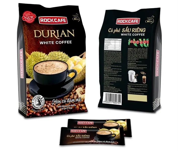 Cà phê Sầu Riêng Rockcafe là sản phẩm cà phê hòa tan 3 in 1, kết hợp cà phê Robusta với hương vị đặc trưng của sầu riêng và sữa béo. Sản phẩm đóng gói tiện lợi theo gói nhỏ, phù hợp cho việc pha chế nhanh tại nhà hoặc văn phòng.