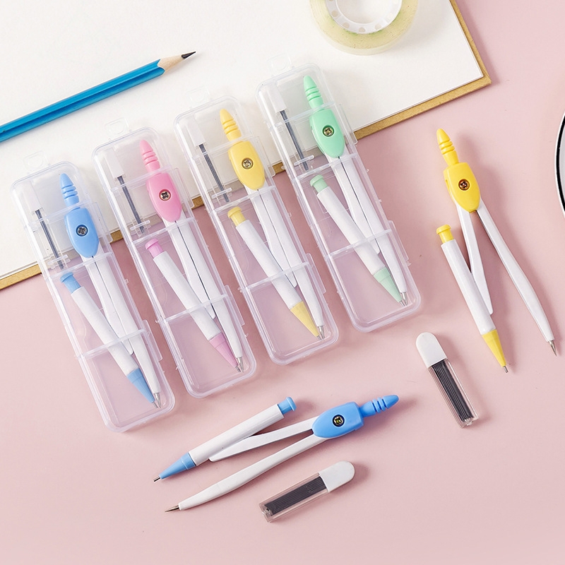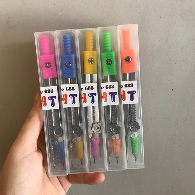 - Bộ compa bút chì kim cute rẻ đẹp bằng nhựa (3 chi tiết) - Compa là dụng cụ không thể thiếu đối với mỗi học sinh, sinh viên, nhân viên đo đạc, vẽ, ... - Compa được sử dụng để vẽ các nét, đường cong một cách dễ dàng và thuận lợi. - Có nhiều loại compa: compa bút chì kim, compa chì gỗ, compa bộ, ...Trong đó, compa bút chì kim được nhiều người sử dụng hơn cả, bởi sự tiện lợi và nét vẽ mềm mịn và đẹp. - Bộ compa học sinh gồm: + 1 compa có phần bút dùng ngòi chì kim, nét nhỏ và chính xác. + 1 hộp ngòi chì. + Màu sắc: Hồng, xanh lá + Có hộp đựng compa riêng lên rất là tiện dụng. * Compa chì khúc 688. Xuất xứ : Việt Nam + Có sẵn ngòi chì không cần lắp thêm - Quy cách 1 cái/ hộp - Màu sắc: nhiều màu ngẫu nhiên - Compa là dụng cụ học tập quan trọng, không thể thiếu của học sinh, sinh viên - Compa giúp người dùng dễ dàng vẽ các đường cong hình học