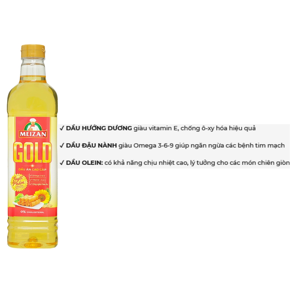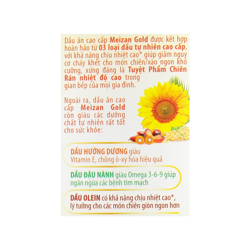+ Loại dầu: Dầu thực vật + Dung tích: 1 lít, 2 lít + Thành phần: Dầu đậu nành, dầu olein, dầu hướng dương tinh luyện, vitamin A palmitat. + Thích hợp: Chiên, xào, trộn salad, làm bánh, sốt trứng, nấu món chay - Bảo quản: Nơi thoáng mát, nên dùng trong 1 tháng sau khi mở nắp + Thương hiệu: Meizan (Việt Nam) + Sản xuất: Việt Nam. * Tác dụng của sản phẩm với sức khỏe + Ngoài khả năng chịu nhiệt tốt, giảm nguy cơ cháy khét khi nấu nướng, dòng sản phẩm dầu ăn Meizan Gold còn chứa hàm lượng Vitamin E dồi dào, làm chậm quá trình lão hóa, chứa Omega 3, 6, 9 rất tốt cho tim mạch và sự phát triển toàn diện của trẻ nhỏ, giảm nguy cơ mắc bệnh tim mạch. * Hướng dẫn sử dụng + Rất thích hợp dùng để chế biến các món chiên, xào hoặc trộn salad, làm bánh, ngoài ra dầu ăn Meizan Gold có thể dùng để nấu các món chay. * Lưu ý khi sử dụng và cách bảo quản sản phẩm - Bảo quản dầu ăn ở nơi khô ráo, tránh ánh nắng trực tiếp, đóng kín nắp sản phẩm sau khi dùng. Lưu ý không nên sử dụng dầu ăn chiên đi chiên lại nhiều lần để đảm bảo sức khỏe.