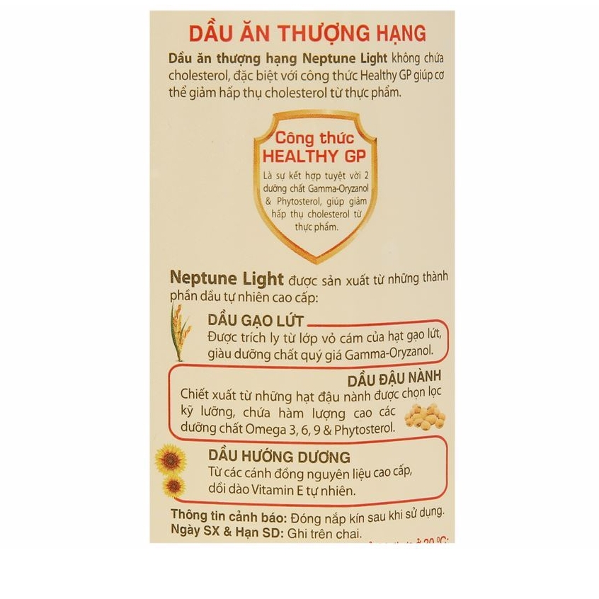 - Loại dầu: Dầu thực vật - Dung tích: 2 lít - Thành phần: Dầu đậu nành, dầu gạo lứt, dầu hướng dương, vitamin A palmitat, thực phẩm tăng cường vi chất dinh dưỡng. - Thích hợp: Chiên, xào, nấu, trộn salad, làm bánh và các món chay - Bảo quản: Nơi thoáng mát, nên dùng trong 1 tháng sau khi mở nắp - Thương hiệu: Neptune (Việt Nam) - Sản xuất tại: Việt Nam. - Thành phần dinh dưỡng trong sản phẩm + Thành phần dinh dưỡng trong Dầu ăn thượng hạng Neptune Light can 2 lít chứa nhiều giàu Omega 3, 6, 9 & Phytosterol, vitamin A palmitate, thực phẩm tăng cường vi chất dinh dưỡng. + Trong 100g dầu ăn có khoảng 900 Kcal. + Giảm nguy cơ viêm nhiễm + Giúp tăng cường dưỡng chất cho cơ thể + Giúp da mịn màng + Cung cấp axit amin béo thiết yếu cho cơ thể. * Hướng dẫn sử dụng sản phẩm - Dầu ăn thích hợp dùng cho các món chiên, xào, nấu, trộn salad, làm bánh và thích hợp cho các món chay. * Lưu ý khi sử dụng và cách bảo quản Dầu ăn thượng hạng Neptune Light can 2 lít * Bảo quản nơi khô ráo, thoáng mát, nên dùng trong 1 tháng sau khi mở nắp.