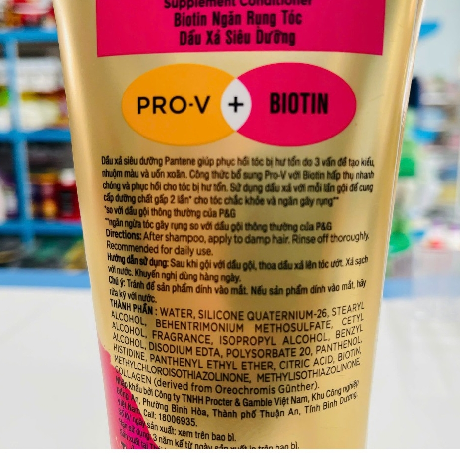 * Thông tin sản phẩm + Dầu xả thương hiệu dầu xả Pantene của Mỹ sản xuất tại Thái Lan. + Dầu xả Pantene siêu dưỡng tóc, ngăn rụng tóc 300ml sử dụng công thức Pro-V đặc biệt giúp mang lại hiệu quả diệu kỳ chỉ sau 3 phút. + Giúp tóc chắc khoẻ từ bên trong cấu trúc tóc. + Duy trì độ dẻo dai của tóc để giảm tóc rụng. - Thương hiệu: Pantene - Sản xuất tại: Thái Lan - Công dụng: Ngăn rụng tóc - Thành phần: Pro-vitamin - Mùi hương: Thơm dịu nhẹ - Dung tích: 300ml * Hướng dẫn sử dụng + Sau khi gội đầu, cho một lượng sản phẩm vừa đủ ra lòng bàn tay, xoa đều ra 2 lòng bàn tay rồi bôi đều lên da đầu và tóc, sau đó mát-xa da đầu và xả sạch lại với nước lạnh * Chú ý + Dùng ngoài da. Để ngoài tầm tay trẻ em, rửa sạch bằng nước nếu sản phẩm dính vào mắt. * Bảo quản + Nơi khô ráo thoáng mát, tránh ánh nắng trực tiếp