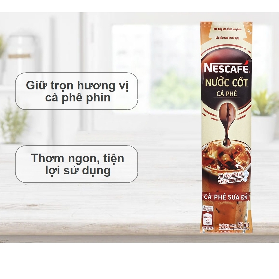 * Sản phẩm được mô phỏng kỹ thuật pha phin bao gồm nén, ủ và chiết giữ lại hương vị cà phê đậm đà truyền thống. Hộp 5 gói nước cốt cà phê đen NesCafé 75ml chính hãng cà phê Nescafé tiện lợi, chỉ cần thêm đá dùng ngay, chất lượng như cà phê phin, nhanh chóng như cà phê hòa tan. * Thương hiệu: NesCafé + Sản xuất tại: Việt Nam + Loại sản phẩm: Cà phê đen + Loại cà phê: Nước cốt cà phê đen + Lượng đường: Có đường * Thành phần: Nước, hỗn hợp nước cốt cà phê (40,5%), đường, chất điều chỉnh độ acid, hương liệu giống tự nhiên, chất ổn định, muối iot, chất tạo ngọt tổng hợp. - Đóng gói: Dạng hộp - Khối lượng tổng: 375ml - Số lượng: 5 gói - Khối lượng lẻ: 75ml - Sử dụng: Chỉ cần cho vào ly thêm đá, khuấy đều và thưởng thức * Điểm nổi bật: Sản phẩm mô phỏng kỹ thuật pha phin, giữ lại hương vị cà phê truyền thống Bảo quản nơi khô ráo thoáng mát...