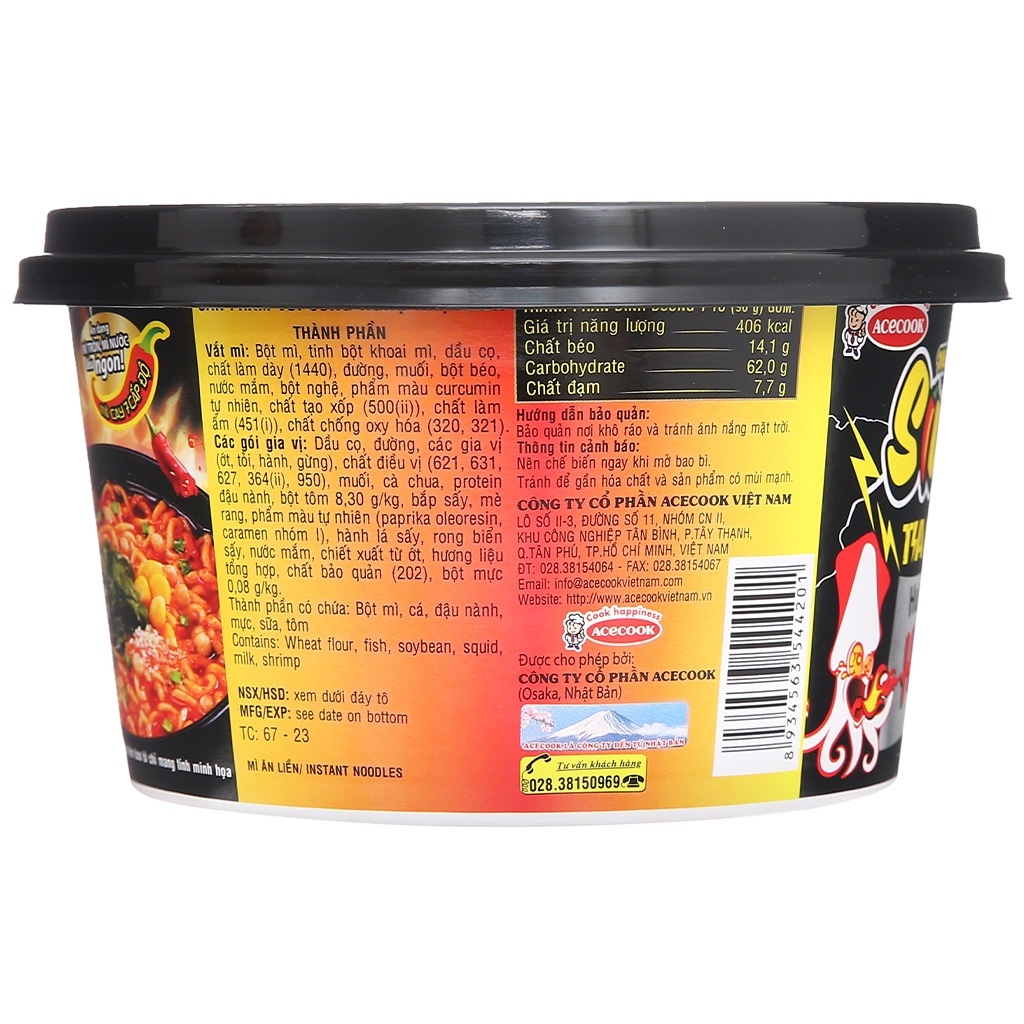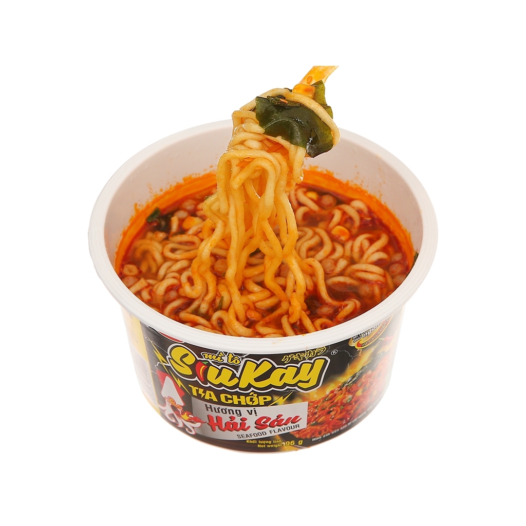 * Sợi mì vàng dai ngon hòa quyện vào nước súp mì SiuKay vị hải sản đậm đà thấm từng sợi hấp dẫn cùng hương thơm lừng quyến rũ ngất ngây. Mì hải sản SiuKay tia chớp tô 96g tiện lợi, có thể ăn dạng mì nước hay mì xào đều ngon, hương vị hải sản thơm ngon và vị cay nồng cực đã. - Loại mì: Mì nước, mì xào - Vị mì: Hải sản - Sợi mì: Sợi tròn, to - Khối lượng: 96g * Thành phần + Vắt mì - bột mì, tinh bột khoai mì, dầu cọ, chất làm dày, đường, muối, bột béo, nước mắm, bột nghệ, phẩm màu curcumin tự nhiên, chất tạo xốp, chất làm ẩm, chất chống oxy hóa + Các gói gia vị - dầu cọ, đường, các gia vị (ớt, tỏi, hành, gừng), chất điều vị, muối, cà chua, protein đậu nành, bột tôm, bắp sấy, mè rang, phẩm màu tự nhiên, hành lá sấy, nước mắm, chiết xuất từ ớt, hương liệu tổng hợp, chất bảo quản, bột mực * Cách dùng + Dạng nước - Mở nắp nhựa và tháo hoàn toàn nắp mạ nhôm ra khỏi tô. Cho các gói gia vị vào tô. Chế nước sôi đến vạch trong tô, dậy chặt nắp nhựa lại chờ 4 phút, trộn đều là dùng được ngay + Dạng trộn - Mở nắp nhựa và tháo hoàn toàn nắp mạ nhôm ra khỏi tô. Lấy các gói gia vị ra. Cho gói rau vào tô. Chế nước sôi đến vạch trong tô, đậy chặt lại nắp nhựa và chờ 4 phút. Mở nắp nhựa ra đảo đều, sau đó đậy chặt lại chắt bỏ nước qua các lỗ trên nắp nhựa. Mở nắp, trộn đều cùng các gói gia vị và thưởng thức * Bảo quản: Để nơi khô ráo, thoáng mát tránh ánh nắng mặt trời. - Thương hiệu: SiuKay (Việt Nam) - Sản xuất tại: Việt Nam
