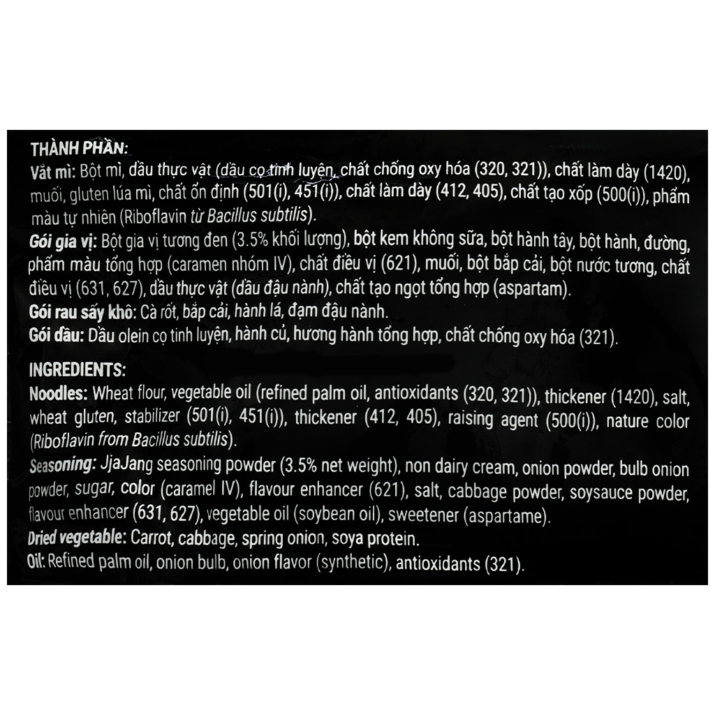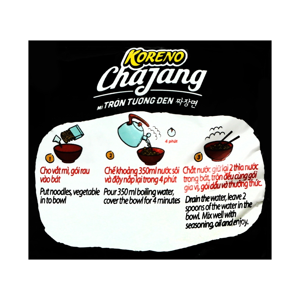 - Loại mì: Mì trộn - Vị mì: Tương đen - Sợi mì: Sợi tròn, nhỏ - Khối lượng: 78g * Thành phần - Vắt mì - Bột mì, dầu thực vật (dầu cọ tinh luyện, chất chống oxy hóa (320,321)), chất làm dày (1420), muối, chiết xuất nấm men, gluten lúa mi, chất nhũ hóa (chất ổn định 420ii), chất nhũ hóa (322(i), 475), dầu đậu nành), chất ổn định (501(1), 451(i)), chất tạo xốp (450(iii), 500(i)), chất làm dày (412, 405), chất điều vị (631, 627), phẩm màu tự nhiên (Riboflavin từ Bacillus subtilis). - Gói gia vị - Bột gia vị tương đen (3.4% khối lượng), bột kem không sữa, bột hành tây, bột hành, đường, phẩm màu tổng hợp (caramen nhóm IV), chất điều vị (621), bột bắp cải, muối, bột nước tương, chất điều vị (631, 627), chất tạo ngọt tổng hợp (aspartam). - Gói rau sấy khô - Cà rốt, bắp cải, hành lá... - Gói dầu - Dầu olein cọ tinh luyện, hành củ, hương hành tổng hợp, chất chống oxy hóa (321). * Cách dùng + Cho vắt mi và gói rau vào bát, chế khoảng 350ml nước sôi vào và đậy lại trong 4 phút. Chắt giữ lại 2 thìa nước trong bát, trộn đều cùng gói gia vị, gói dầu và thưởng thức * Báo quản nơi khô ráo và tránh ánh nắng mặt trời, nên chế biến ngay khi mở bao bì, tránh để gần hoá chất và các sản phẩm có mùi mạnh. - Thương hiệu: Koreno (Việt Nam) - Sản xuất tại: Việt Nam
