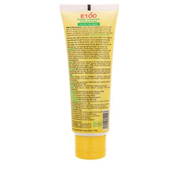 * Thông tin sản phẩm Sữa rửa mặt E100 sẽ thấm sâu vào bên trong mô da, giúp làm mờ các vết đốm trên da. Từ đó, sữa rửa mặt sẽ cho bạn làn da tươi khỏe và sáng mịn. Sữa rửa mặt nghệ E100 100g được đặc chế từ tinh chất nghệ và hoạt chất diệt khuẩn Triclosan có tác dụng làm trắng da, sạch mụn cám và lấy đi tế bào chết. - Thương hiệu: E100 (Việt Nam) - Sản xuất tại: Việt Nam * Công dụng + Giúp lấy đi các tế bào chết, bụi bẩn tận sâu lỗ chân lông. + Làm sáng da, mềm mại và sạch mụn. + Sản phẩm thích hợp với mọi loại da, đặc biệt là da thâm mụn. * Thành phần + Tinh chất nghệ, hoạt chất kháng khuẩn Triclosan - Độ pH: Từ 5.5 - 6.5 - Loại da phù hợp: Mọi loại da - Khối lượng: 100g - Hướng dẫn sử dung + Làm ướt mặt, đổ một ít sữa vào lòng bàn tay và nhẹ nhàng xoa chúng lên da mặt, sau đó rửa sạch với nước hoặc dùng khăn giấy mềm lau sạch. + Thích hợp sử dụng hàng ngày - Độ tuổi phù hợp: 15 tuổi trở lên * Lưu ý + Thực tế bạn thì việc bạn ra nắng vào thời điểm từ 9h sáng cho đến 16h chiều nhất là vào mùa hè thì việc bắt nắng là điều không tránh khỏi ngay cả khi không sử dụng sản phẩm. + Bởi vậy khi ra ngoài nắng bạn cần sử dụng kem chống nắng và che chắn để bảo vệ tốt nhất cho da. * Bảo quản + Nơi thoáng mát, tránh nhiệt độ cao và ánh nắng trực tiếp...